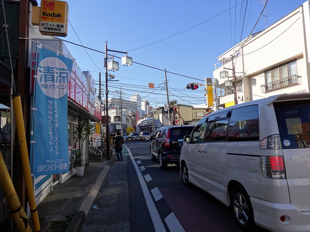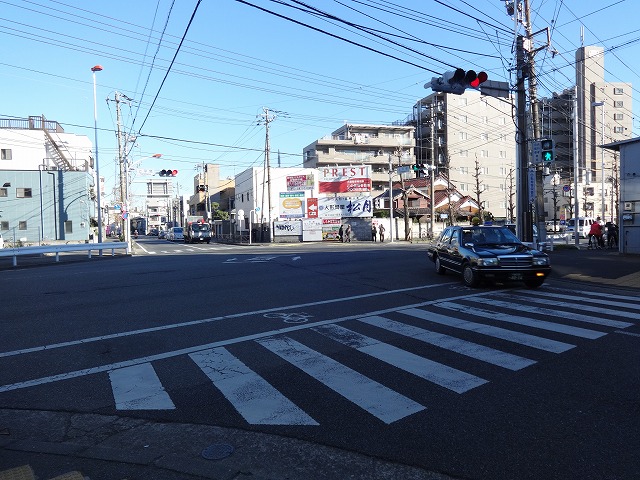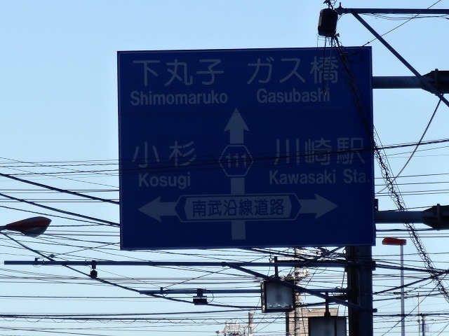 | ガス橋通りを進むと、南武沿線道路にぶつかります。上平間交差点です。 |