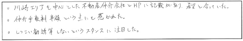 初めての手続きばかりで必要書類や時期を早く教えてもらえたので仕事のスケジュール調整がたてやすかったです。 以前も物件見学の山岸さんの感じが良かったので今回の物件も取扱確認してお願いしました。売主さんと先方不動産担当者手続きの時、手際の違いをものすごく感じました。山岸さんはgood jobでしたが担当者によって大きく差があるなぁと感じる手続きでした。何でも相談(聞き)やすいし事務所の方も人当たりの良さにリラックスして相談できたし楽しく進められました。 ★矢向駅前八百屋で買った”みかん”が美味しかったです(笑)