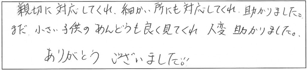 「親切に対応してくれ、細かい所にも対応してくれ、助かりました。」