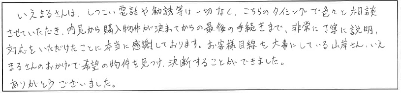 ご契約からお引渡しまでの流れをしっかり理解され、ご不安がなくなり無事に購入して頂くことができました。