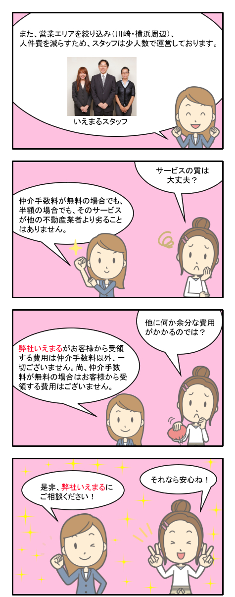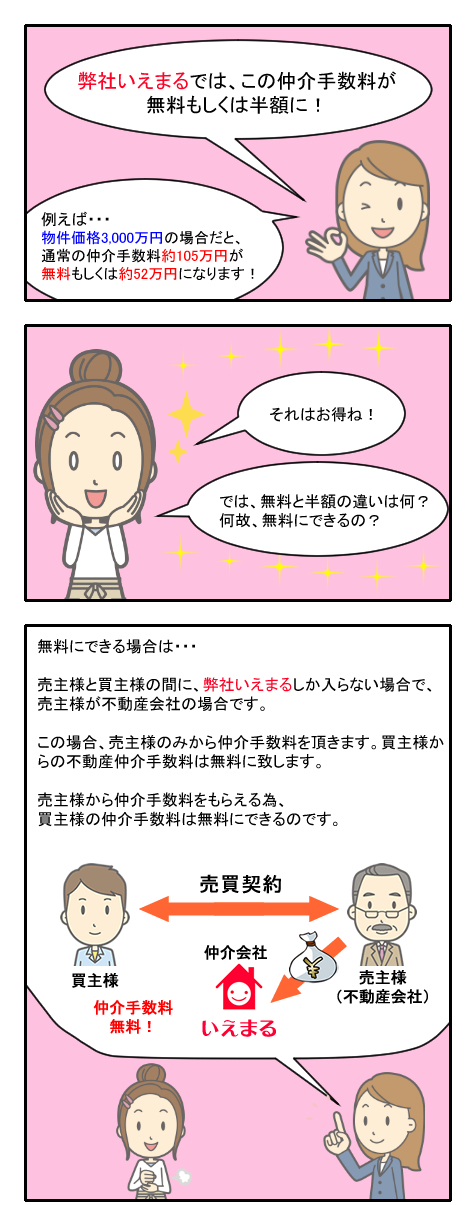 →“売主様”から仲介手数料を頂くことができますが、“売主様”から仲介手数料も半額とさせて頂いておりますので、