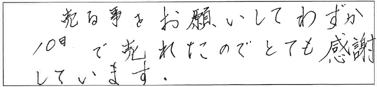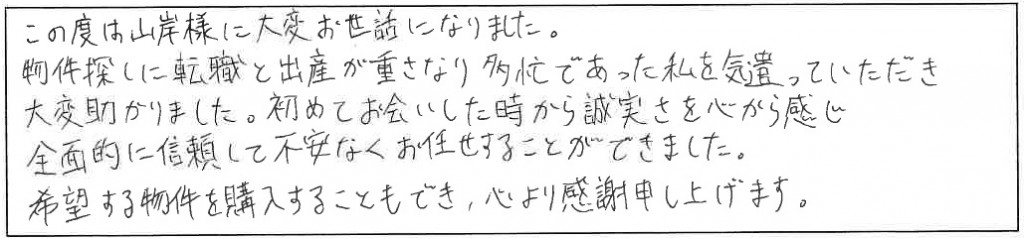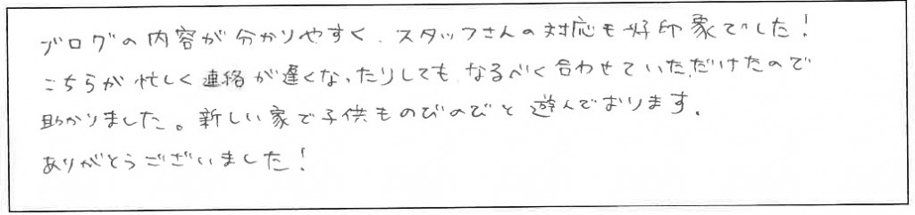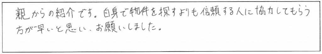 「物件の引渡しまで誠実に対応していただきました。質問に対するレスポンスも早く、とても満足できました。」