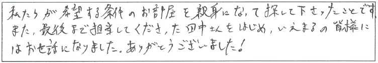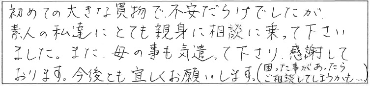 「銀行の話など親身になって相談に乗ってくれて、大変お世話になりました。」