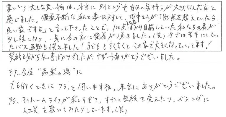 契約後にお部屋の再内覧、住宅ローン審査の手続き、銀行との金消契約、引渡し日などなど、何度かお会いしましたがいつも笑顔で喜ばれていました。