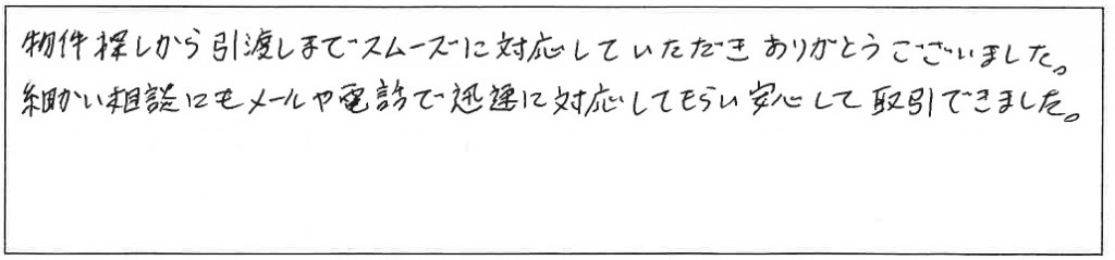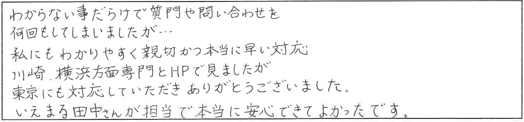 初めての手続きばかりで必要書類や時期を早く教えてもらえたので仕事のスケジュール調整がたてやすかったです。 以前も物件見学の山岸さんの感じが良かったので今回の物件も取扱確認してお願いしました。売主さんと先方不動産担当者手続きの時、手際の違いをものすごく感じました。山岸さんはgood jobでしたが担当者によって大きく差があるなぁと感じる手続きでした。何でも相談(聞き)やすいし事務所の方も人当たりの良さにリラックスして相談できたし楽しく進められました。 ★矢向駅前八百屋で買った”みかん”が美味しかったです(笑)