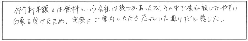 立地はもちろんのこと、広さ・価格等の条件も満たした物件が出てよかったです。