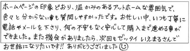 こまめにご連絡を頂き、とてもスムーズにお引渡しまで進めることが出来ました。