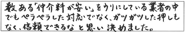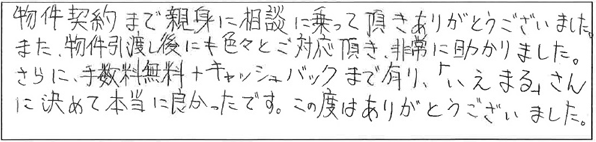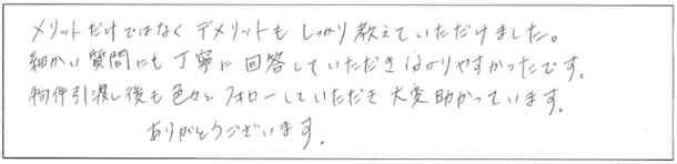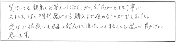 「質問にも親身にお答えいただき対応も丁寧で、ストレスなく進めることができました。」