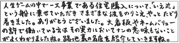 住宅ローンの手続きも、手際よく進めて頂きましたので、お引渡しまでスムーズでした。