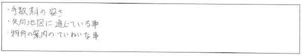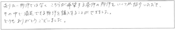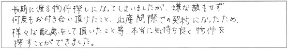 限られた期間での物件探しでしたので、短期間の間にたくさんの物件をご案内させて頂きました。一度、申込みをした物件は2番手となってしまい、買い逃してしまいました。