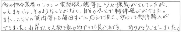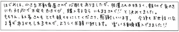 楽しく不動産購入できたようで、よかったです。明るいご夫婦で、私も楽しかったです。