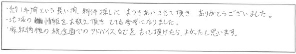 物件探しの当初は、室内の状況が悪い物件が多く、驚かれていらっしゃいましたが、最終的にご購入頂いた物件は室内の状況がとても良く、リフォームの必要もありませんでした。ガスコンロの不具合も売主様負担で直して頂くことができ、よかったです。