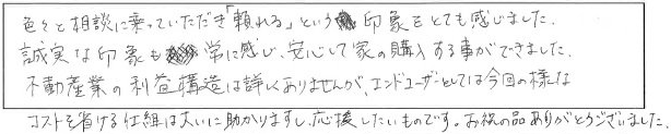 住宅ローンの手続きや、スケジュール調整等、K様はいつも素早い対応!助かりました。