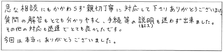 急な相談にもかかわらず親切丁寧に対応して下さりありがとうございました。