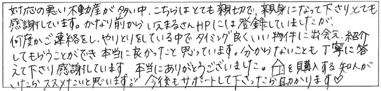 対応の悪い不動産が多い中、こちらはとても親切で、親身になって下さり、とても感謝しています。
