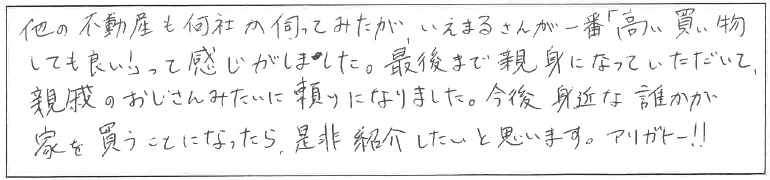 他の不動産も何社か伺ってみたが、いえまるさんが一番「高い買い物しても良い!」って感じがしました。