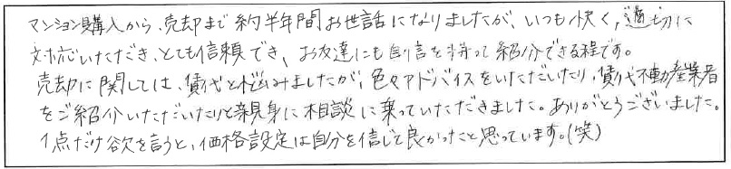 マンション購入から売却まで、約半年間お世話になりましたが、いつも快く適切に対応いただき、とても信頼でき、お友達にも自信を持って紹介できる程です。
