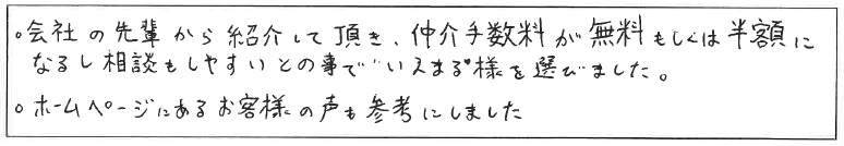 ◦会社の先輩から紹介をして頂き、仲介手数料が無料もしくは半額になるし相談もしやすいとの事で『いえまる』様を選びました。