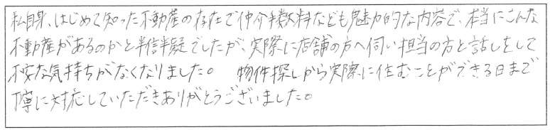 物件探しから実際に住むことができる日まで丁寧に対応していただきありがとうございました。