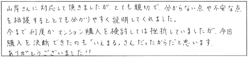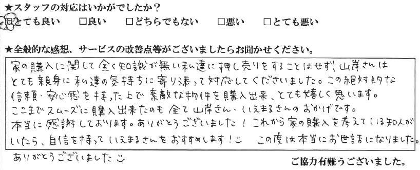 家の購入に関して全く知識が無い私達に押し売りをすることはせず、山岸さんはとても親身に私達の気持ちに寄り添って対応してくださいました。