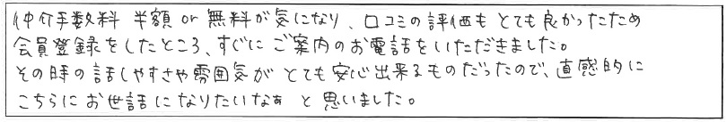 仲介手数料半額or無料が気になり、口コミの評価もとても良かったため会員登録をしたところ、すぐにご案内のお電話をいただきました。