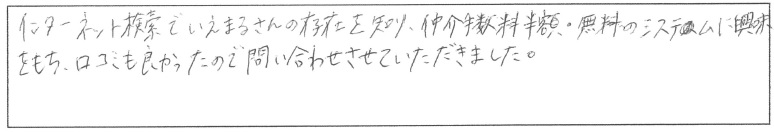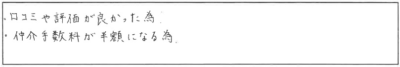 仲介手数料半額or無料とのことで興味を持ち、HPを見て評判も良さそうだったのでこちらに決めました。