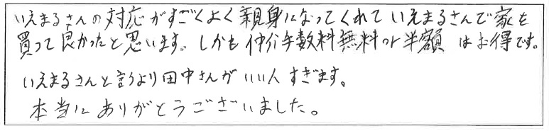 「対応がすごくよく親身になってくれて、いえまるさんで家を買って良かったと思います。」