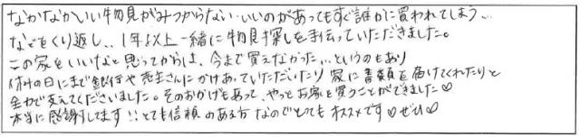中原区のリフォーム済み中古マンションをご購入されました。 N様は、最初にお問い合わせ頂いてから、だいぶ時間が経過してからのご購入になりましたが… その間に、何度か気に入られた物件を他の方に買われてしまったことがありました…。 今回の物件は売り出されて間もない物件をN様自らネットで検索されて、 弊社にお問い合わせ頂きました。 内覧後、奥様にとても気に入って頂き、その後、ご主人様にもご覧頂いて… と、トントンとお話しが進み、ご契約いただきました。 ローンの手続き等でちょっとお待たせしたり…もありましたが、 先日、無事にお引き渡しになり、何よりです! 写真は、残金決済が終わった後の銀行にて、奥様と息子さんのツーショットです。(ご主人様はお仕事でご欠席でしたので…) すぐにお引越しをされるそうで、奥様の嬉しそうな笑顔が印象的でした! また、機会がありましたら、是非、いえまるにお声掛け下さい! 弊社をご利用いただき、誠に有難うございました。