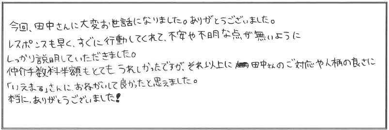 「仲介手数料半額はとてもうれしかったですが、それ以上に田中さんのご対応や人柄の良さに「いえまる」さんにおねがいして良かったと思えました。」