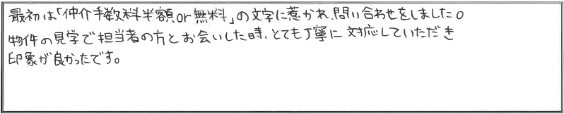 物件の見学で担当者の方とお会いした時に、とても丁寧に対応していただき印象が良かったです。