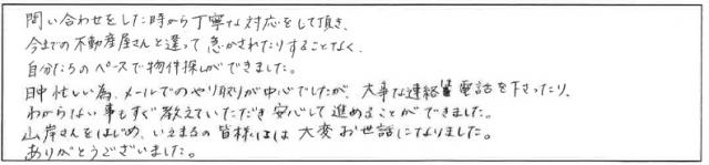 横浜市港北区の中古マンションをご購入されました。 Y様は、いえまるにお問い合わせ頂いた時点で、 「お子様の幼稚園に行ける範囲」という、 ご希望のエリアを明確に決めていらっしゃいました。 マンションと戸建で悩んでいらっしゃいましたが… 最終的にマンションをご選択されました。 ご購入された物件は、リビングの広い大型の3LDKで、 日当たりがとても良いお部屋でしたね! 先日、アンケートを持って、ご家族みなさんでいえまるに寄ってくれました。 おみやげも頂いちゃいまして…有難うございました! また、機会がありましたら、是非、いえまるにお声掛け下さい! 弊社をご利用いただき、誠に有難うございました。