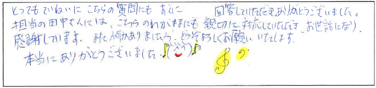 担当の田中さんには、こちらのわがままにも親切に対応していただき、お世話になり、感謝しています。